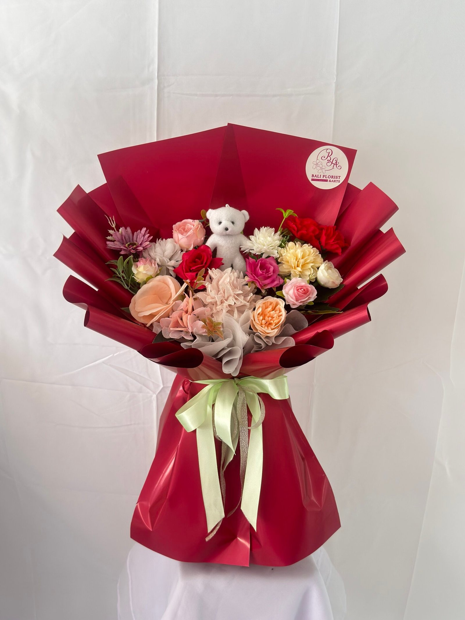 Bouquet bunga artificial mix warna ini hadir dengan sentuhan elegan, dibalut wrapping kertas cellophane dan dihiasi boneka kecil yang lucu. Sempurna untuk menjadikan setiap momen lebih berkesan.