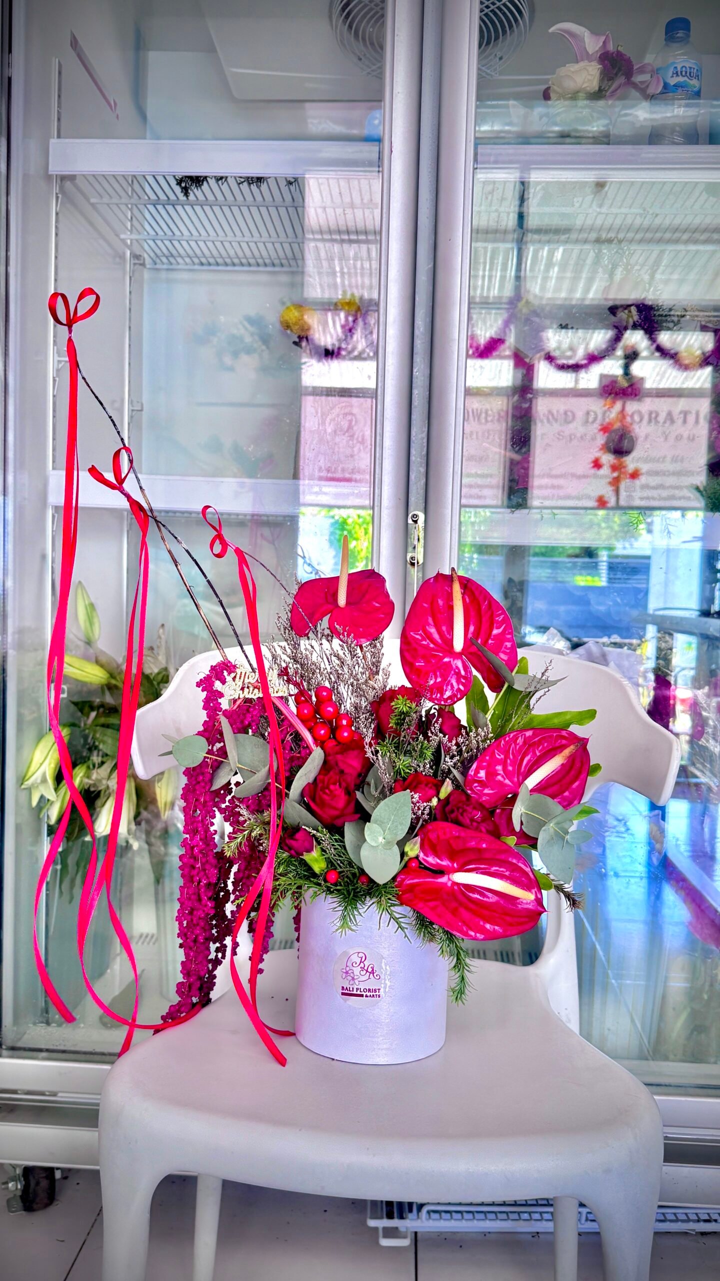 This thoughtfully designed floral arrangement blends premium red blossoms with luscious greenery, balancing elegance with a natural touch. Its chic aesthetic makes it suitable for romantic gestures, celebrations, or simply bringing warmth to your favorite corner.