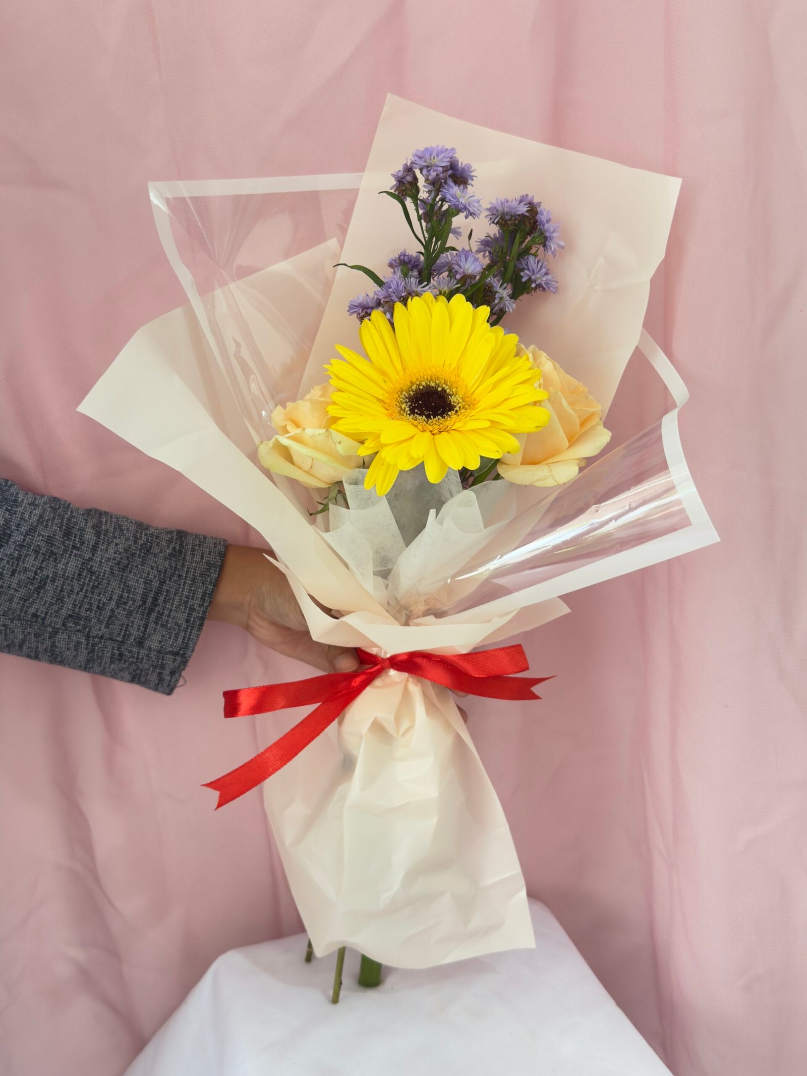 Dibungkus dengan teknik wrapping minimalis namun tetap cantik, buket ini cocok untuk memberikan kesan elegan tanpa terlihat berlebihan. Perpaduan warna cerah dari bunga gerbera dan pikok menciptakan harmoni yang mempesona.